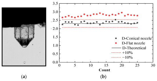 Image of (a) conical nozzle and (b) comparison of droplet diameter distributions resulting from the flat and conical nozzles.