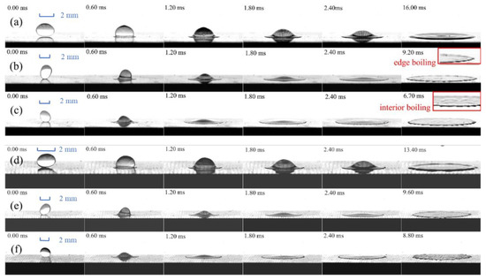 Spreading process of R1336mzz(Z) droplets impinging on low and high roughness surfaces at different We. (a) We = 77, (b) We = 521 and (c) We = 948 (Ra = 0.8 µm); (d) We = 81, (e) We = 543 and (f) We = 936 (Ra = 6.3 µm).