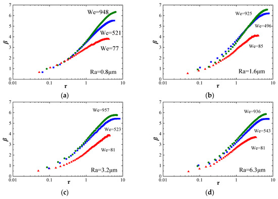 β-τ curves at different We. (a) Ra = 0.8 µm. (b) Ra = 1.6 µm. (c) Ra = 3.2 µm. (d) Ra = 6.3 µm.