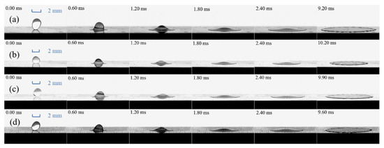 Spreading process of R1336mzz(Z) droplets impinging on different roughness surfaces at medium We (We ≈ 520). (a) Ra = 0.8 μm, (b) Ra = 1.6 μm, (c) Ra = 3.2 μm and (d) Ra = 6.3 μm.