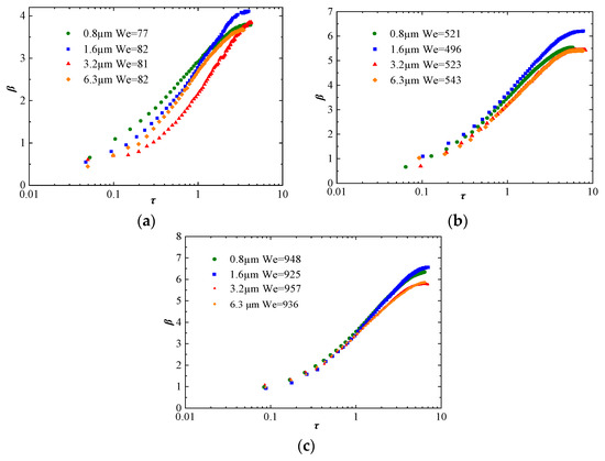 - We had a significant effect on the dynamic behavior of droplet spreading. When 0 < τ < 0.1, the β-τ curves almost coincided. At τ = 0.1, the curves of low We had a lower slope and were separated from those of medium and high We. At about τ = 1, the curves at medium We separated from the curve at high We number. With the increase in We, the curve slope became larger, and τ to reach βmax became longer.
