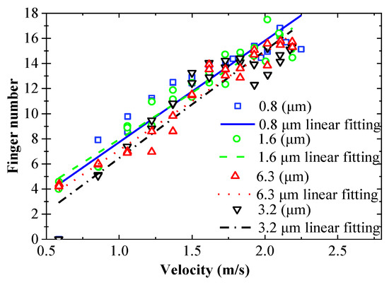 The “finger disturbance” observed in this study is weak but has more waves. To eliminate the influence of different initial diameters on the number of fingers, the number of fingers following refers to the total number of fingers at the maximum diameter divided by initial diameters, that is, the number in a unit circumference of a droplet. Figure 8 shows the relationship between the number of “fingers” and impact velocity on different roughness surfaces. It can be inferred that roughness has little effect on the number and shape of the “finger” disturbance, but impact velocity mainly determines the finger number. This finding is consistent with that of Aziz and Chandra [36]. R-Square testing was used to explore the relationship between finger number and impact velocity. The R-Square value on four roughness surfaces are 0.838, 0.922, 0.876, and 0.948 in turn, and it is concluded that the number of fingers presents almost linear variation with the impact velocity.