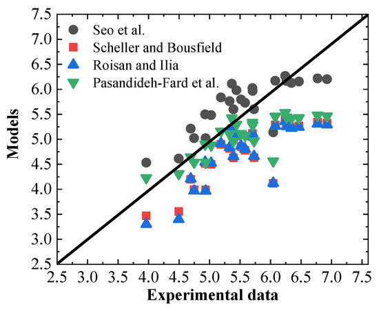 The βmax of droplets impingement is one of the most important parameters of droplet impact dynamics, which directly represents the spreading ability of droplets under different working conditions. Studying βmax has many applications in inkjet printing, spray cooling, and other fields. The maximum spreading factor βmax is closely related to We and Re numbers, as demonstrated by previous studies. Pasandideh–Fard et al. [37] proposed a model to describe the variation of βmax with We and Re based on energy conservation of kinetic energy, surface energy, and viscous dissipation, considering droplets at maximum spreading diameter as cylindrical geometry. Compared with experimental data, the model showed a mean error of 8.70%. Roisman and Ilia [50] proposed a semi-empirical model considering the flow within the impacting droplet and showed the largest mean error of 14.64%. Scheller and Bousfifield (1995) [51] proposed an empirical formula based on regression analysis where the mean error is 14.33%. Seo et al. [14] found that existing models did not perform well for low-viscous liquids and modified the Scheller and Bousfifield model by changing its coefficients, which showed better agreement with different liquids.