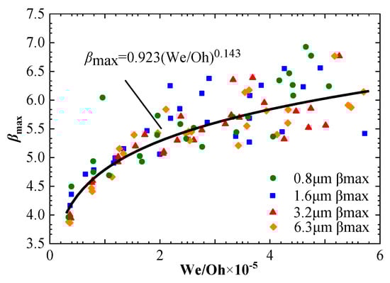 Experimental data and model prediction of βmax by the new empirical formula of droplet impinging on four different roughness surfaces.