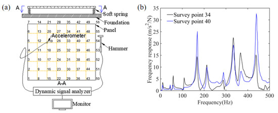 In the mode tests, the corrugated panels were supported by four soft springs to mimic the free boundary conditions. The selection criteria of the soft spring are: the frequency of the vibration system formed by the soft spring and the plate is lower than the first-order natural frequency of the plate; that is to say, the vibration of the panel relative to the soft spring is the movement of the overall panel, and the simulation and experimental results can be compared to verify whether the selection of the soft spring is reasonable. As schematically shown in Figure 2a, the springs are located at the four corners of the rectangular panel. An impact hammer was used to excite the vibration of the panel at the measure points, as shown in Figure 2a. For accuracy, the average data of the three parallel tests were reported. The vibration signal was captured by an accelerometer bonded at point 19 and was finally transmitted to the dynamic signal analysis system developed by Donghua Testing Technology Co., Ltd., Taizhou, China. For the hammering mode test, the governing differential equation of a continuous system excited by a hammer force {F(t)} can be written as [43]: