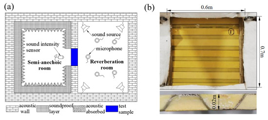 A sound intensity test was conducted to evaluate the sound transmission loss (STL) of the composite panels [45,46]. The tests were performed in a reverberation room and a semi-anechoic room, which were connected by a sound insulation wall, as shown in Figure 3a. The samples were placed in an open window, in the center of the wall. The size of the window was around 0.6 × 0.7 m (see Figure 3b). Due to the large error of the low-frequency test, this test was performed in the frequency range of 400 to 8000 Hz.