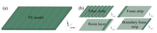 As shown in Figure 4a, the FE models of the corrugated composite panels investigated in this research were established by using a commercial software UG NX, and the specific parts of the panel model are shown in Figure 4b. Both the fiber cloth and the resin layer were meshed with CQUAD4 elements, whereas the foam strips were meshed with CHEXA8 elements. The components were assembled by using a merge technique which makes the joint surface between components have common nodes. According to the literature [48], at least ten elements per local wavelength were ensured at the highest frequency in the simulation analysis. Therefore, the element size was set to be 2 mm to guarantee the precision of the analysis. Material properties of the considered parts were obtained from the data listed in Table 1 and Table 2. Corresponding to the mode tests, a free boundary condition was used for the panel model to calculate the modes.