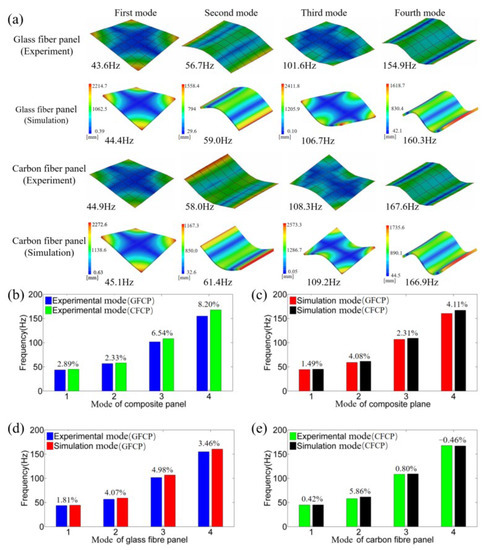 As shown in Figure 5b, the experimental mode of GFP is the reference value, and it can be found that the mode frequencies of CFP were larger than those of the GFP, and the fourth experimental mode error was the highest. The simulation mode analysis is shown in Figure 5c, and the simulation mode of GFP is the reference value. The simulation results show the same law as the experimental results. In Figure 5d,e, the experimental modes of panels are the reference values. The errors between the experimental and the simulation modes were all less than 6%, which indicates that the results obtained from the proposed FE model showed very good agreement with the experimental results.