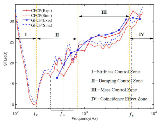 As depicted in Figure 6, it was found that the critical frequencies of the CFCP and GFCP were almost similar. Additionally, the surface density of the GFCP was slightly higher than that of the CFCP. Therefore, considering Equation (8), the stiffness of the GFCP was also slightly higher than that of the CFCP, which finally resulted in a higher STL of the former in Stage I (Stiffness Control Zone).