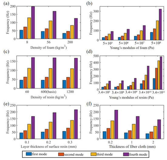 Parametric studies on the effects of the related design parameters on the vibration properties of the CFCPs. (a) The effect of foam density. (b) The effect of foam’s Young’s modulus. (c) The effect of resin density. (d) The effect of resin’s Young’s modulus. (e) The effect of layer thickness of surface resin. (f) The effect of the fiber cloth thickness.