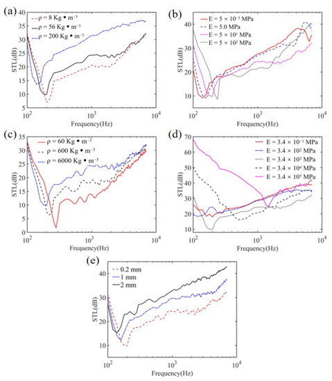 The effects of the resin density and its Young’s modulus on the STL are shown in Figure 8c,d), respectively. Similar to the effects of the foam density, the first resonance dip () moved to a lower frequency while increasing the resin density; nevertheless, the STL at increased. In addition, it can be seen that in the Damping Control Zone (about 300–1000 Hz), the STL fluctuated sharply with the frequency increase, which is likely owing to the change of the resin density, which significantly affects the mode vibration properties of the sandwiched panels. A similar effect of the resin density was also found in the Mass Control Zone; nevertheless, this effect gradually decreased with the increasing frequency (see Figure 8c).