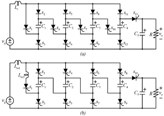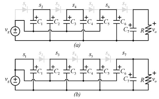 - Muller, L.; Kimball, J.W. Dual-input high gain DC–DC converter based on the Cockcroft-Walton multiplier. In Proceedings of the 2014 IEEE Energy Conversion Congress and Exposition (ECCE), Pittsburgh, PA, USA, 14–18 September 2014; pp. 5360–5367. [Google Scholar] [CrossRef]