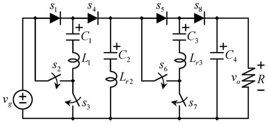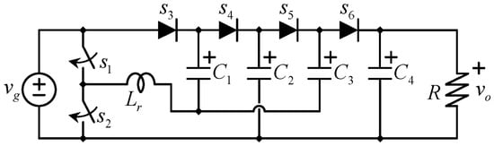 - Valdez-Reséndiz, J.; Claudio-Sánchez, A.; Rosas-Caro, J.; Guerrero-Ramírez, G.; Mayo-Maldonado, J.; Tapia-Hernández, A. Resonant switched capacitor voltage multiplier with interleaving capability. Electr. Power Syst. Res. 2016, 133, 365–372. [Google Scholar] [CrossRef]