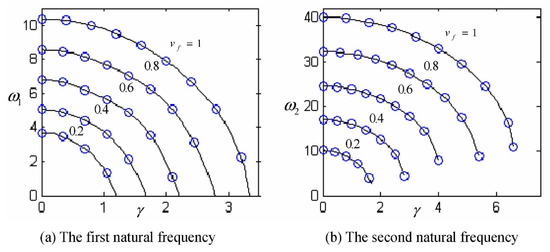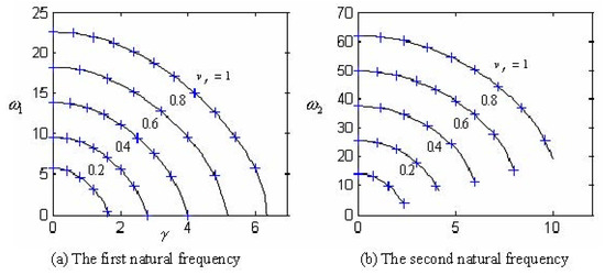 First, to facilitate comparison with classical results, we plot the natural frequencies in the subcritical region in Figure 2 and Figure 3, where ω is the axial speed and γ is the natural frequency. Note that the subcritical natural frequency decreases as the axial speed increases for both the pinned–pinned and fixed–fixed cases. If V = 0, these series of curves in Figure 2 and Figure 3 will reduce to a series of points on the y-axis, which means that the subcritical natural frequency becomes a fixed value.
