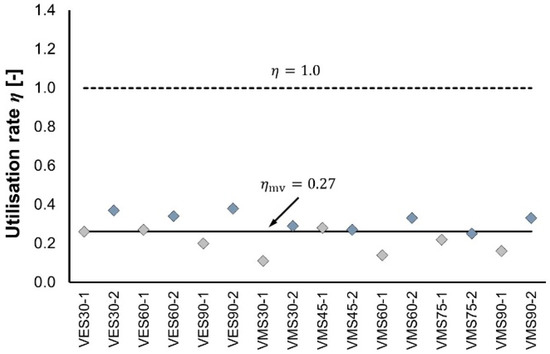 The calculation of the fibre slenderness related to the utilisation rate in Figure 7 depends on a fibre tensile strength of approximately 3576 N/mm2 that has been measured in [1]. However, the manufacturer states a tensile strength of approximately 2000 N/mm2. If the utilisation rate is now correlated to the manufacturer’s data, it results in a significantly higher rate and a smaller safety margin (see Equation (8)).