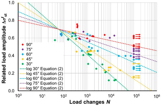 Figure 4 shows that the fatigue resistance of fibres embedded in UHPC depends significantly on the orientation angle. For each orientation studied, an S/N-line was established using a regression formula given in Equation (2). Detailed background information can be found in [19].