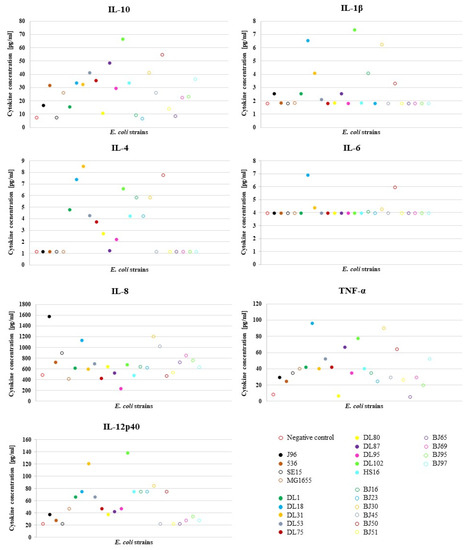 In our study, the production of cytokines INF-α and INF-γ was not detected, which was to be expected, as these two cytokines have not been previously associated with E. coli infections. They are involved in antiviral immune responses [35] and, in addition, INF-γ is also involved in immunological processes in infections caused by some bacteria (Mycobacterium tuberculosis, Salmonella, Listeria) and some parasites (Leishmania, Toxoplasma, Chlamydia) [36].