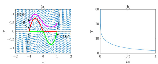 (a) The vector field of the Hamiltonian system. The red and green curves denote the OP from to and its reverse, respectively. The purple curve is a typical example of the NOP from to . (b) The time required for a Hamiltonian orbit to hit the line from the initial point .