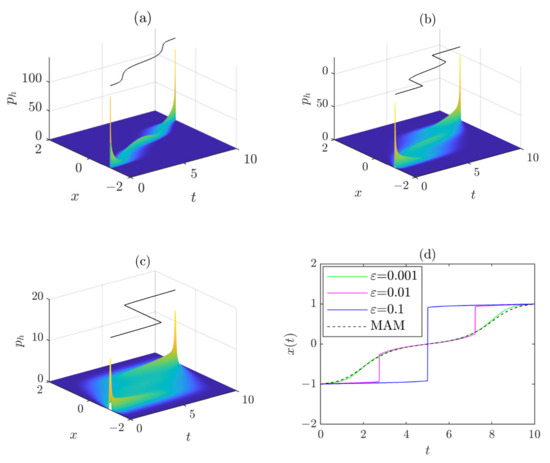 To demonstrate how the nonstationary PPD can pinpoint the location of the NOP, we first calculate the time required for an NOP to reach the target point. As shown in Figure 2b, this is a monotone function of the initial momentum. For any choice of , a unique NOP exists, and no singular behavior arises consequently. The PPD will always present a single peak trajectory accordingly. Now, let . The PPDs and their peak trajectories for various noise intensities are illustrated in Figure 3. The results can be compared with those obtained by the minimum action method (MAM) [47] (details of the MAM are presented in Appendix A). This shows that our numerical method could approximate the NOP fairly well when is small enough. However, the matching effect soon fails as increases. In particular, the hopping of the peak trajectory of the PPD occurs, as displayed in Figure 3b,c. The law for all of the fluctuation paths connecting with is initially concentrated on the domain near . Larger noise makes significant fluctuation more likely. Consequently, a local peak near emerges as time goes by, whose height subsequently exceeds that of the original one and dominates the law at the end. This is a result caused by the -dependent part of Equation (46), including the part in the drift term as well as the weak Gaussian noise. To ensure that the peak trajectory of the PPD converges to the NOP, both of them require . As a result, lowering or will reduce the error of our algorithm. As we can see from Figure 3d and Figure 4, for a fixed , the peak trajectory of the nonstationary PPD coincides with the NOP only if the noise intensity is small enough, while for a fixed , the deviation of the peak trajectory from the NOP increases as increases. The larger is, the smaller the needed to ensure the matching effect between the two paths. The numerical results are in perfect agreement with our theoretical predictions.