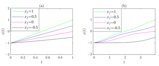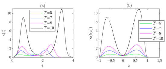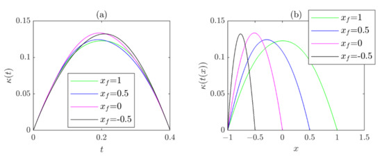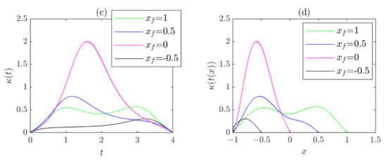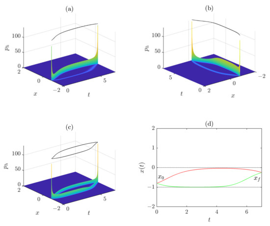 If is a smooth function, there exists a unique path connecting with the prescribed point ; thus, the PPD has a single peak trajectory. However, what is similar to stationary cases is the troublesome non-differentiability. In nonstationary cases, this takes place more frequently—even in equilibrium systems. Here, we can also divide the space into three parts () according to the number of solutions to the constrained Hamiltonian problem (Equation (10)), as well as their value of the action (Equation (3)). For points located in these sets, the nonstationary PPD possesses a unique peak trajectory, a unique highest peak trajectory, and multiple highest peak trajectories with the same height. This is similar to the stationary situation, which will not be repeated here.