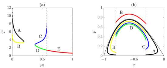 In the end, we show the multiple-peaks effect of the PPD. Here, we can assume that . In this case, the circular phase trajectories in the interior of the heteroclinic orbits now serve as the optimal phase orbits of our optimization problem. The time required for an NOP to reach the target point is illustrated in Figure 8a. We can divide them into five scenarios, each of which has a typical example displayed in Figure 8b. This shows that, as , there are only two principal phase orbits as candidates for the NOP: case B and case C (case A must have a larger action). Which one dominates the PPD depends on the value of the action. Since they approach the heteroclinic orbits, their action could be approximately estimated by and , respectively. Thus, the switch between different optimal paths occurs when xf is close to a point satisfying . For our choice of , we get . The PPD and its peak trajectories for , , are presented in Figure 9, confirming the above analysis.