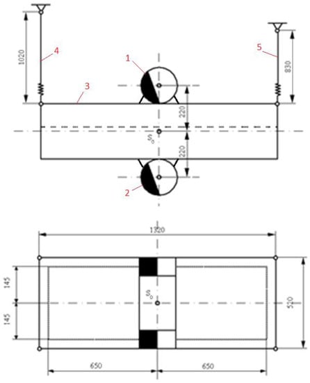 Prototype double-frequency sifter—main dimensions. 1, 2—movable rotary vibrators, 3—screen, 4, 5—springs.