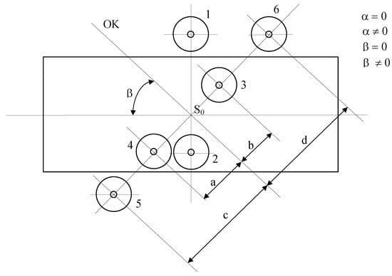 The double-frequency screen analyzed comprised two driving vibrators and a rectangular riddle mounted on a spring suspension. The design allowed for changing the riddle’s inclination by the angle within the range of 0–20° and for changing the spacing of the vibrators (Figure 4). The corresponding direction of vibration main components along the OK axis was inclined by the angle . Position 1 was related to the top vibrator, while position 2 was to the bottom one. The centers of both vibrators could be displaced, independently of each other, relative to the point along the riddle operating plane. As shown in Figure 4, such displacements were equal to: