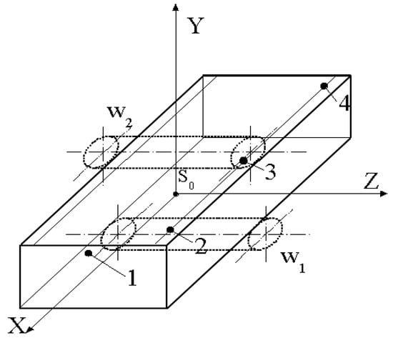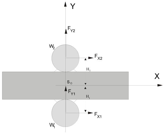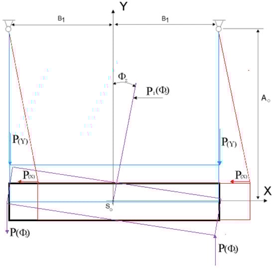 The position of equilibrium of the screen body in the center of mass S0 was related to a right-handed system of x, y, and z coordinates (Figure 5). Relative to such a system, the screen body has 6 degrees of freedom in space. However, due to the lack of stimulating forces acting in the z-direction, the considered system was limited to the XY plane transverse to the operating plane of the screen (perpendicular to Figure 5). The damping in the considered system was omitted. The angles of rotation of the solid around the transverse axis z are denoted by .