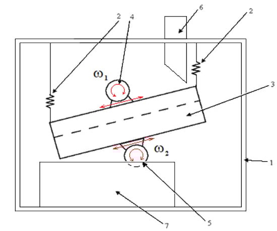 The schematic representation of the test unit. 1—frame, 2—elastic screen suspension, 3—riddle with a sieve, 4, 5—vibrators, 6—movable charging hopper, 7—a container for sifted material.