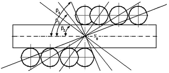 The vibrator setting can be modified (Figure 8) by its drawing aside a distance chosen against the central part of the sieve (an upper vibrator in the direction of the feeder, a bottom one in the direction of the end of the screen). Particularly, the four vibrator positions reached in the mentioned manner for the distance of 0, 110, 220, and 380 mm caused the oscillating sieve trajectory angle β with values equal to β1 = 0°, β2 = 27.5°, β3 = 42.2°, and β4 = 61°, respectively.