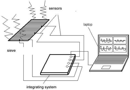 The sieve vibration amplitudes were measured using the system schematically presented in Figure 10. It comprised the piezoelectric sensors, the integrating system, and a computer with a measurement card allowing data recording. The piezoelectric sensors were able to measure the vibration acceleration in the range 0–100 m/s2, for the frequency range 2–5000 Hz, and with the measurement resolution of 0.1 m/s2.
