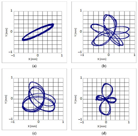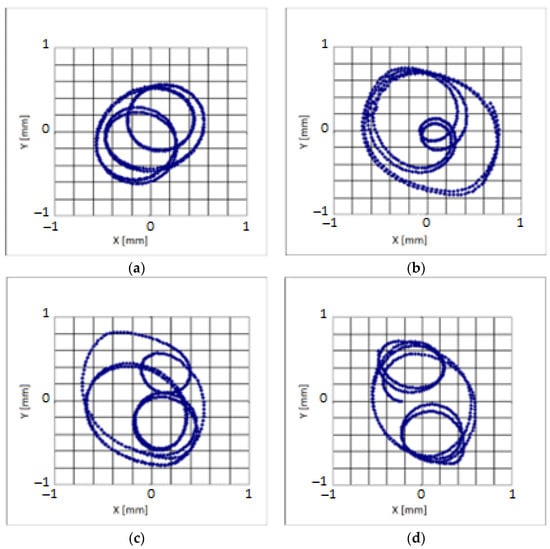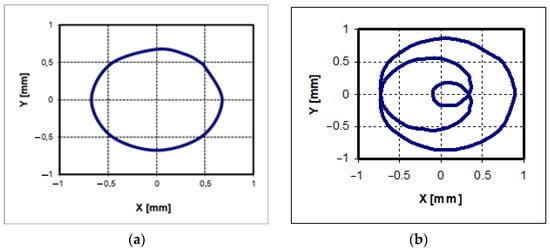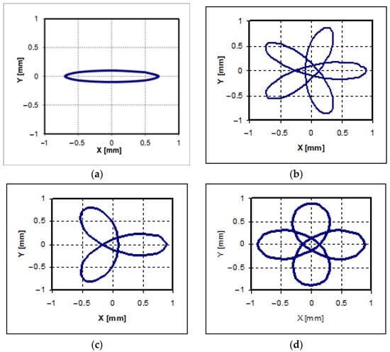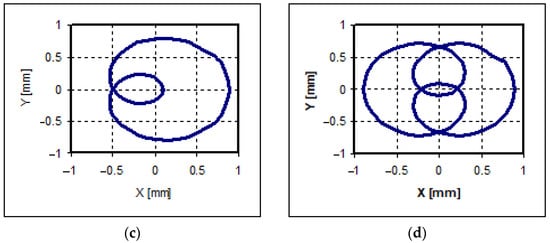 Figure 12 and Figure 13 showed projections on the plane of the system of temporary positions of the screen’s center of gravity, according to the observation time. The set of instantaneous solid positions during the set period of motion created the traffic paths for the compatible (Figure 12) and the reverse (Figure 13) synchronizations, respectively. The data for the calculations were the parameters of the screen installed on the experimental stand, such as mass 150 kg, system stiffness in y and x directions: 21,712 N/m, mass moment of inertia relative to the z-axis, 110 kg m2, real geometrical dimensions of components involved during motion of the screen. The speed ratios of rotary drive vibrators (rpm) took the consecutive values, relating to the subcomponents of: