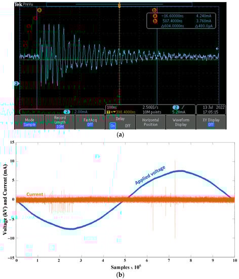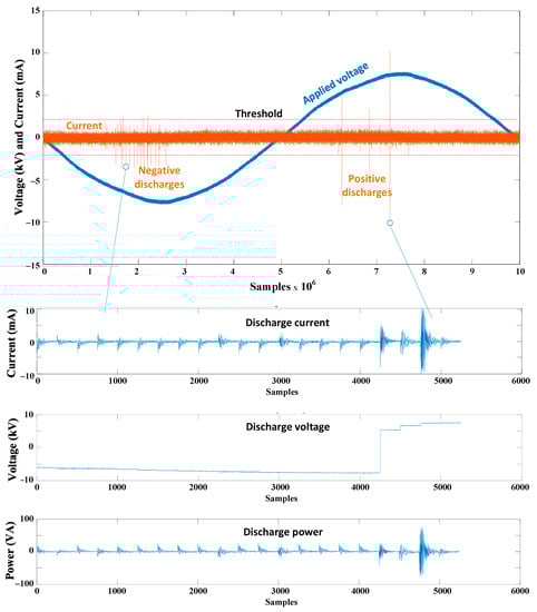 Although (1) is easy to apply, some considerations are required due to the high-frequency components and the short duration of the discharges. First, the discharges appear in different points in the waveform, initially appearing during the negative semi period of the voltage, and as the voltage increases, they also appear during the positive semi period. It means that each discharge has its own voltage, which is not constant during the duration of the discharge. Second, due to their low level, it is easier to distinguish the discharges in the current waveform than in the voltage waveform, as seen in Figure 1.