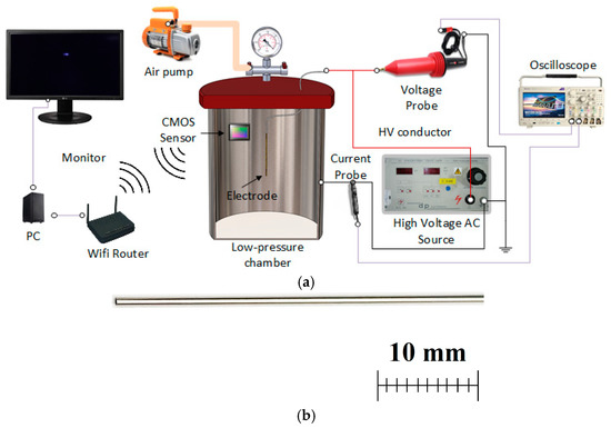 The stainless-steel low-pressure chamber consists of a 375 mm × 260 mm (height × diameter) cylindrical vessel and a methacrylate lid that allows the photographs to be wirelessly transmitted to a computer located near the chamber. The chamber is grounded during the experiments. The low-pressure chamber contains the smartphone used to take the long exposure photographs and the needle-plane gap, as shown in Figure 4.