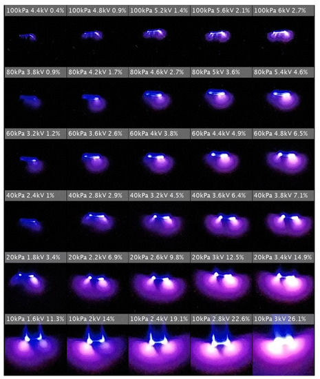 Long exposure photographs of the discharges (32 s) were taken to increase the number of photons reaching the sensitive elements of the image sensors and thus the sensitivity of the method. Figure 5 summarizes some of the photographs of the discharges acquired under different experimental conditions, that is, under variable pressures within the range of 100–10 kPa and different applied voltages. It is seen that, for a fixed pressure, the intensity of the discharge increases with the applied voltage.