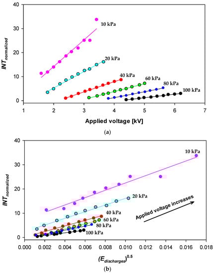Figure 6a summarizes the experimental relationships between INTnormalized and the applied voltage, while Figure 6b shows the experimental measurements obtained with the photometric (INTnormalized) and electric (Edischarges0.5) methods and their linear fittings at different operating pressures characteristic of aeronautical environments.