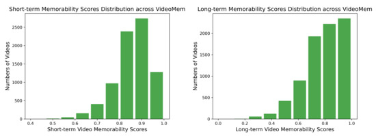 In this paper, Spearman’s rank correlation coefficient is used to calculate the correlation between the video memorability scores predicted by our model and the real video memorability scores. The closer the Spearman coefficient is to 1, the higher the correlation between the predicted value and groundtruth. On the contrary, the closer the coefficient is to −1, the lower the correlation. Indicators commonly used in statistics to measure the correlation between two variables include Person correlation coefficient [52], Spearman’s rank correlation coefficient [53] and Kendall correlation coefficient [54]. Pearson’s correlation coefficient applies to continuous data where there is a linear relationship between two variables and the population of the two variables is normally distributed or near-normal unimodal distribution. However, as can be seen from Figure 1, our data are not normally distributed, whether short-term or long-term memory scores. Although Spearman’s rank correlation coefficient and Kendall’s can be used for data with non-uniform distribution, Kendall’s coefficient is more suitable for the multi-column rank correlation degree method. Furthermore, Spearman’s rank correlation coefficient has less strict requirements on data conditions than Pearson’s correlation coefficient. As long as the observed values of the two variables are paired with rank assessment data, Spearman’s rank correlation coefficient can be used to analyze the overall distribution patterns and sample sizes of the two variables.