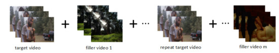 In the experiment to measure the video memorability score, participants were given a series of videos, including target and non-target videos, which we call filler videos. The role of the filler video is to provide the influence of the time interval and other memory points. When the target video appeared, the participant clicked the space bar according to whether he remembered and then asked the participant to measure whether he remembered the target video again after 24–72 h. The experimental process is the same as shown in the Figure 3.