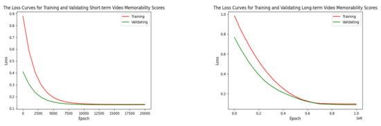The loss curves for training and validating short-term and long-term video memorability scores.
