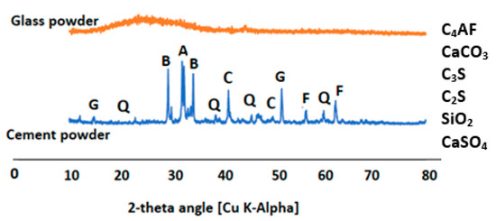 Glass waste was first crushed by a Los Angeles grinding machine before being further ground by a grinding machine with a titanium blade with a 1400 W power rating operating at 220 V and 60 Hz. The oxide composition of cement and glass wastes as obtained from x-ray fluorescence (XRF) is presented in Table 1. The X-ray diffractions (XRD) of the glass waste and cement powder are presented in Figure 2.