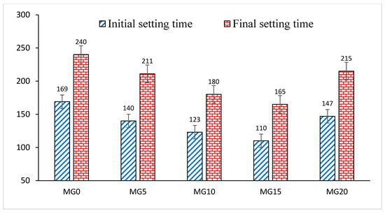 Glass powder has a high proportion of silica, thereby causing the Ca/Si ratio to be reduced. It is also noted that the presence of glass powder prompted the reduction of the initial and final setting time of the mortar due to the simultaneous reaction of tricalcium aluminate (C3A) with gypsum (CaSO4·2H2O) on one hand, and the frictional effect of glass and cement particles on the other hand [6]. The formation of calcium-silicate-hydrate in cement compounds is formed together with hydrated glass particles that occupy the capillary pores, thereby causing early hardening [1]. From Figure 4, it can be seen that the control sample has an initial setting time of 169 min, which decreased by 17.16%, 27.21% and 34.91%, while the final setting time of 240 min was reduced by 12.1%, 25% and 31.25% for the addition of glass powder at 5%, 10% and 15%, respectively. However, when the glass content increased to 20 wt.%, the initial and final setting time reduced by only 13.01% and 10.41%, respectively. This implies that excessive glass content beyond the capillary pore spaces could lead to a dilution effect that affects both setting and strength development. Therefore, early setting could not necessarily lead to early strength development in glass blended mortar.