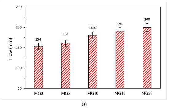 The consistency of mortar increases linearly with the increase in the glass–cement replacement level, as shown in Figure 5a,b. The irregular shape (Figure 3) of glass does not make a significant negative contribution to the flowability of the fresh mix due to the low intra-particle absorption of glass [13]. By replacing cement with 5, 10, 15 and 20 wt.%, the flowability of mortar increased by 4.5%, 17.1%, 24.0% and 30%, respectively. This implies that glass inclusion in mortar can facilitate the reduction of the water–cement ratio [8]. Despite the flowability or consistency of the mixture, no bleeding was observed in both mortar and concrete samples. From Figure 5b, the consistency of the fresh concrete is linearly increasing with the glass content as the slump values increase by 17.3%, 33.3% and 46.7% when the glass content was 10, 20 and 30 wt.%, respectively.