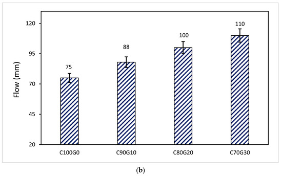 The initial and final setting times of the cement–glass blended paste were determined in accordance with ASTM C191 [32], and the workability of cement–glass blended mortar was measured in accordance with ASTM C1437 [33].