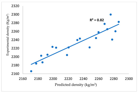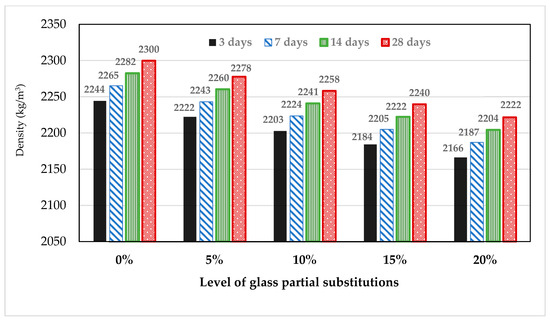 The inclusion of glass in cement mortar causes a decrease in density with age, as shown in Figure 6. The density of mortar increases with the duration of hydration reaction. This implies that as calcium-silicate-hydrate (CSH) is being formed, it occupies some spaces within the microstructure and therefore causes a reduction in capillary pores [36]. A reduction in the capillary pore volume can lead to an increase in the internal density with time. It is also noted that the density decreased with the percentage of cement replacement by glass powder. There was 3.4% loss of density in 28 days in C80G20 (20% glass content). This value reduced to 0.95%, 1.82% and 2.6% when the glass content was 5, 10 and 15 wt.%, respectively. This is due to the higher value of specific gravity of cement (3.15) compared to that glass powder (2.48). Equation (1) was developed to express the density of the mortar in terms of cement content (C), glass content (G) and age. Figure 7 shows the relationship between the experimental and predicted densities with a correlation coefficient of 0.82 at a constant water binder ratio of 0.40.