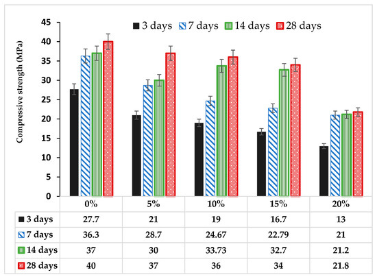 From Figure 8, the compressive strength of the cement–glass blended mortar can be seen to decrease with glass powder content. Glass powder affected both early and later day strength development. The 3-day strength in cement mortar decreased by 24.2%, 31.4%, 39.71% and 53.1% in the mortars MG5, MG10, MG15 and MG20, respectively. The maximum 28-day compressive strength obtained at zero inclusion of glass in mortar was 40 MPa and reduced by 7.5%, 10%, 15% and 45.5% for glass–cement replacement levels of 5%, 10%, 15% and 20%, respectively. Highest strength development (43.5%) was noticed between 7 to 14 days in MG15 and then followed by 36.7% in MG10 with just 5% in MG15. There was no significant strength development from 14 to 28 days in the glass blended mortar sample except in MG5, where the maximum development (23.3%) was achieved. The optimum glass dosage for cement replacement was between 5 to 10 wt.% (by weight of the total binder).