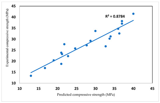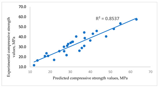Correlation between experimental and predicted compressive strength values of glass blended concrete.