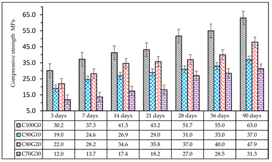 From Figure 10, the compressive strength of concrete increases with days of maturity. Concrete sample C80G20 has the best strength characteristics, and its maximum 3-day early strength was 22 MPa, which was 27.2% of the achievable strength in C100G0 (glass-free). This decreased to 37.2% and 60.3% in C90G10 and C70G30, respectively. The strength development increased linearly with a 90-day strength of 63 MPa in C100G0 and 47 MPa in C80G20 (20% glass). The strength achieved in this sample could be regarded as high-strength concrete. As the glass contents of 10 wt.% (C90G10) and 30 wt.% (C70G30) were added, the strength reduced by 22.8% and 34.7%, respectively.