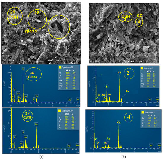 The decrease in the observable strength can be understood from the morphology of the glass blended paste from the scanning electron microscope/energy dispersive electron spectroscopy (SEM/EDS) results, as shown in Figure 12a,b and Figure 13. There is a discontinuity (spectrum 28, Figure 12a) in the region of embedment of glass within the cement matrix.