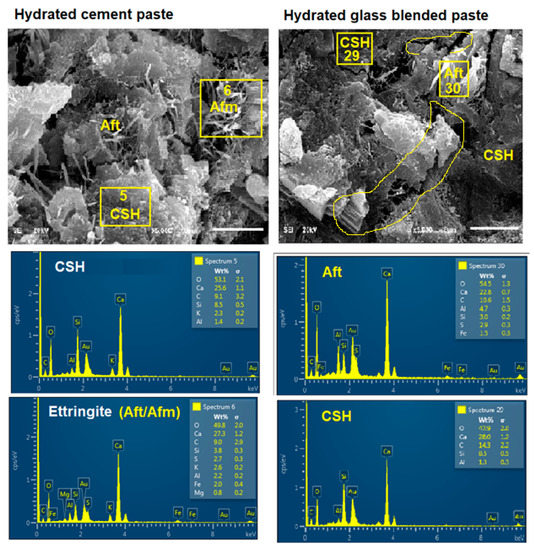 Microstructure of OPC and glass blended pastes (calcium-silicate-hydrate ((CSH) and Ettringite (Aft)).