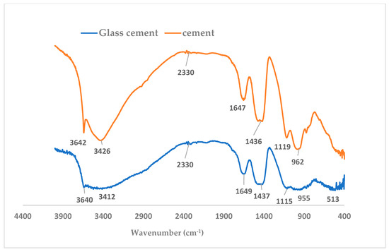 FTIR spectra (Figure 14) show the asymmetric stretching of hydroxyl ions with strong absorption at wavenumber 3642 cm−1 in cement paste, whereas the band was weaker with the wavenumber 3640 cm−1 in the glass blended sample [39]. This also indicates that the early hydration reaction is hindered by the presence of glass particles due to the lower production of hydroxyl-based compound (portlandite).
